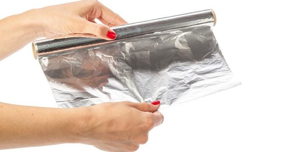 Recubre todo el interior de la caja con el papel aluminio y pégalo con la cinta.