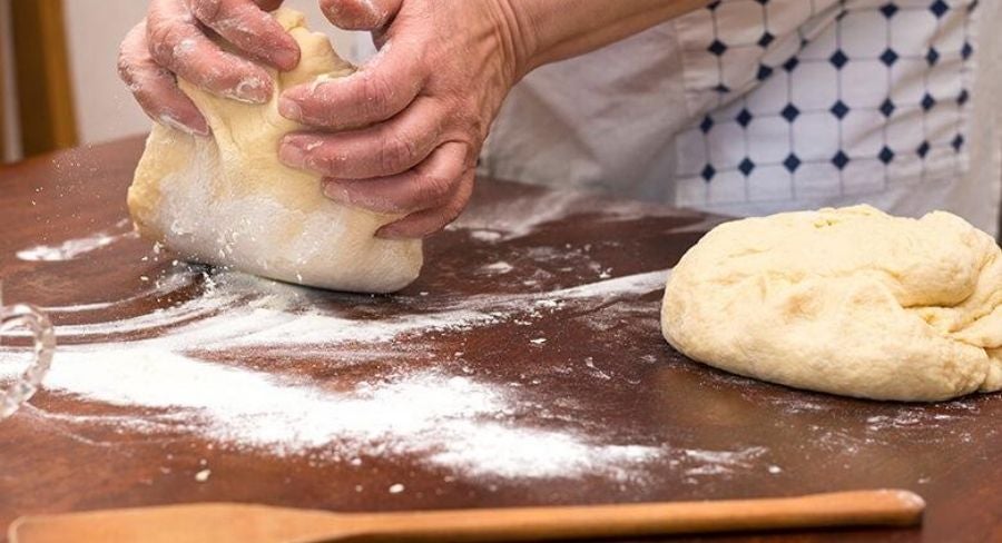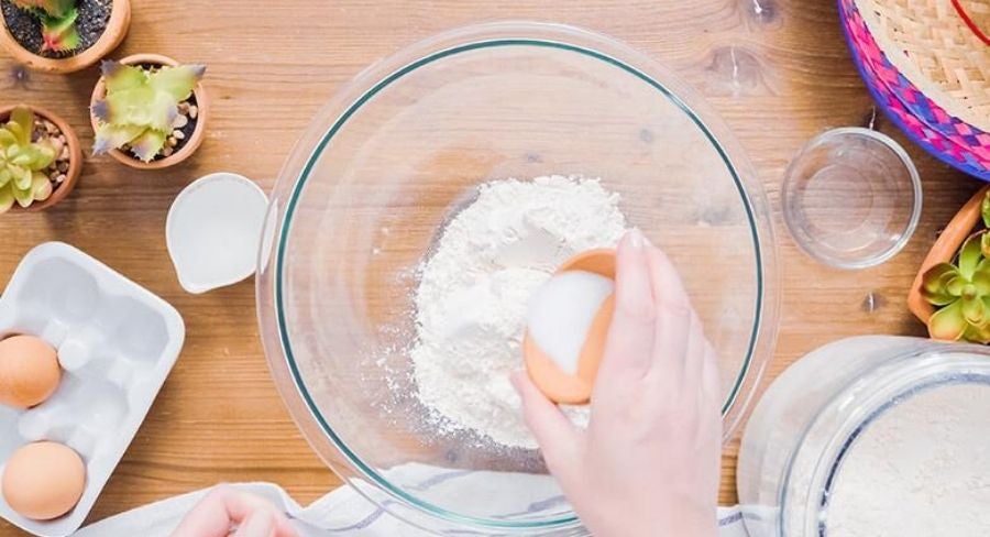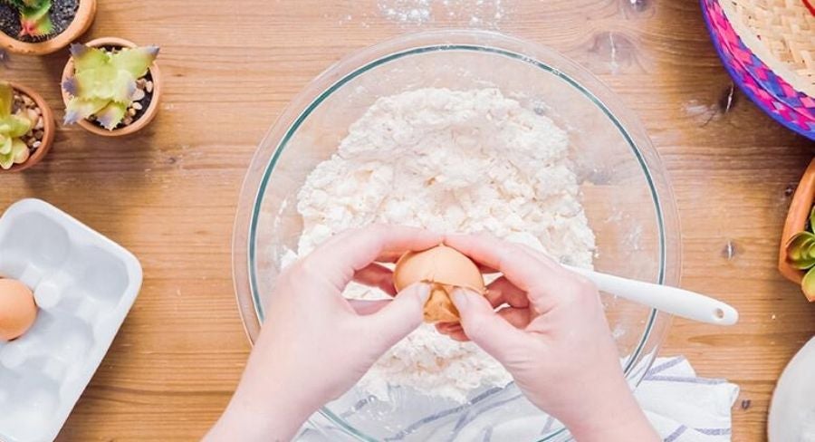El siguiente paso será agregar a la mezcla anterior los huevos y amasar hasta que quede una sola mezcla, después agrega la harina y 4 cucharadas de agua fría, amasa hasta lograr una masa homogénea.