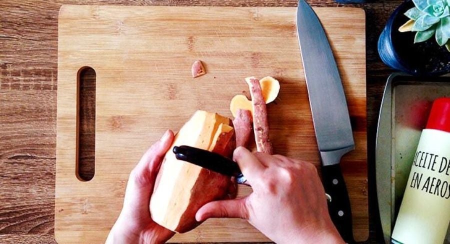 1. Corta los extremos del camote previamente lavado y retira la cáscara con ayuda de un pela papas.