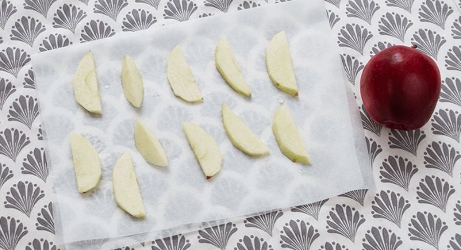 Una vez que hayas terminado de cortar todas las manzanas, colócalas sobre un pedazo de papel para hornear y mételas al congelador por dos horas.