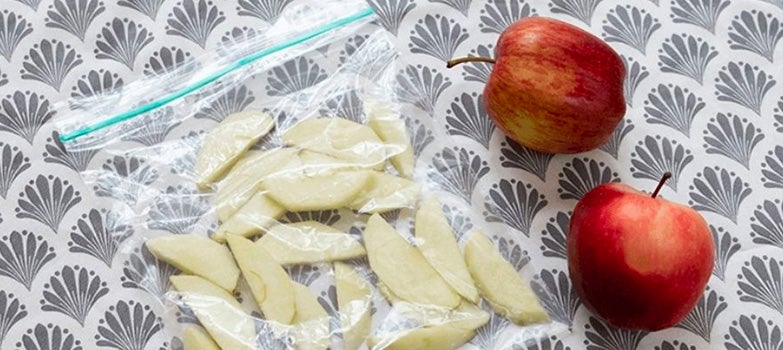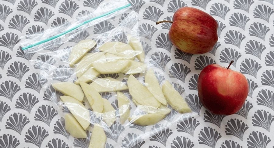 Te sugiero que dividas tus manzanas de acuerdo con el uso que les darás en el futuro, por ejemplo, guarda la cantidad de manzanas suficientes para ese pay de manzana que planeas hornear. Coloca las bolsas en el congelador y ¡listo!