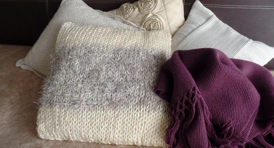 Según las dimensiones del almohadón, dispón los puntos para cubrir el ancho de la funda. Puede que necesites hacer una muestra para ver cómo rinde la lana con las agujas elegidas. En cualquier caso, no hace falta que tomes medidas exactas; puedes ir apoyando el tejido para cotejar la medida.