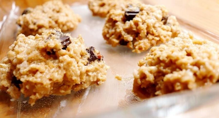 4. Verás que la mezcla está un poco más pegajosa y así está perfecta. Es el momento de agregar los chips de chocolate oscuro y la mantequilla de maní.