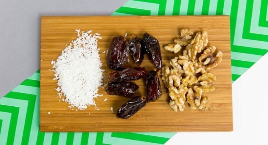 Coloca los dátiles, el coco y las nueces en un procesador de alimentos. Esta será la base de diversos postres fríos, incluyendo este pay. Asegúrate que los ingredientes estén mezclados perfectamente, así como en la foto.
