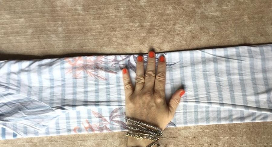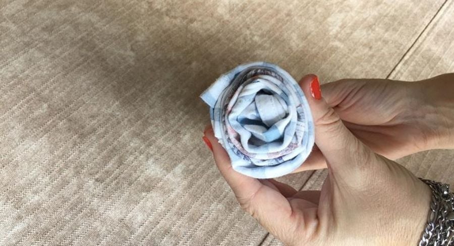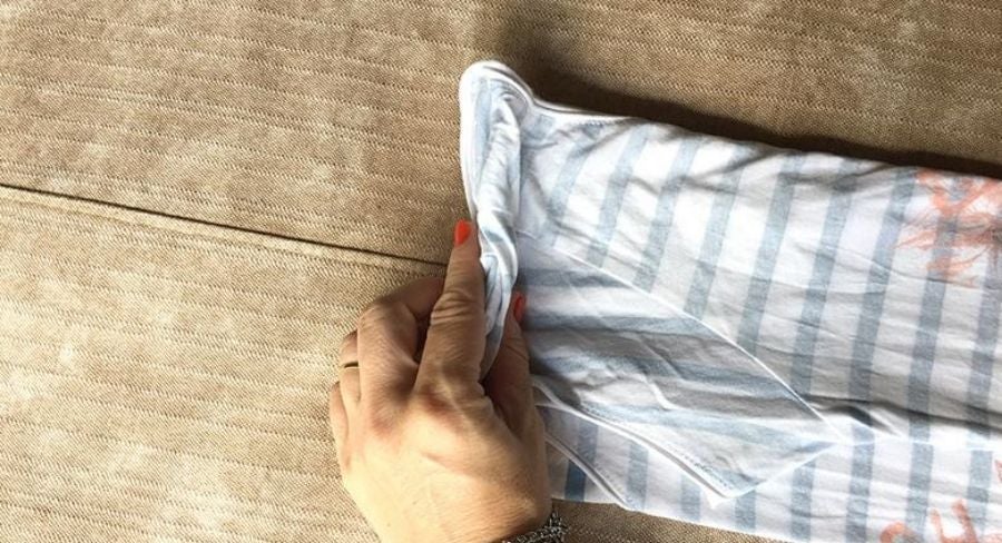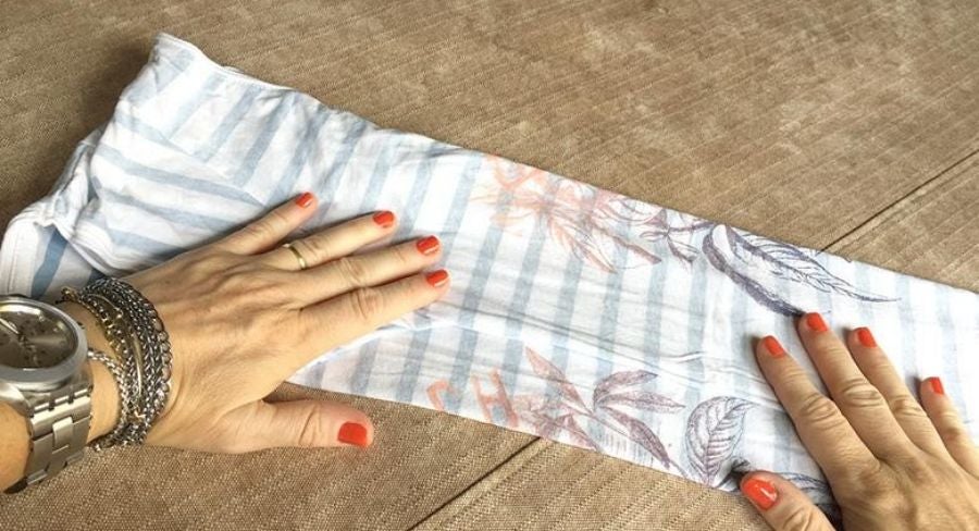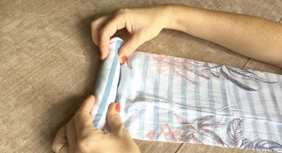Luego, dobla la prenda en tres partes, teniendo en cuenta cuál va a ser la medida del rollo según la altura del cajón. Puedes tomar la medida usando la palma de tu mano como referencia, siempre y cuando el cajón no tenga una altura menor.