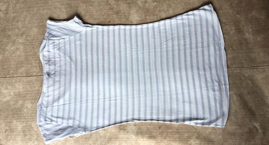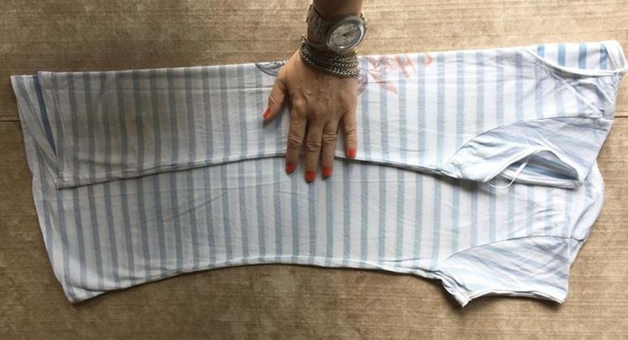 Dobla la camiseta en dos partes, desde los laterales hacia adentro, procurado que quede más o menos del alto de tu mano.