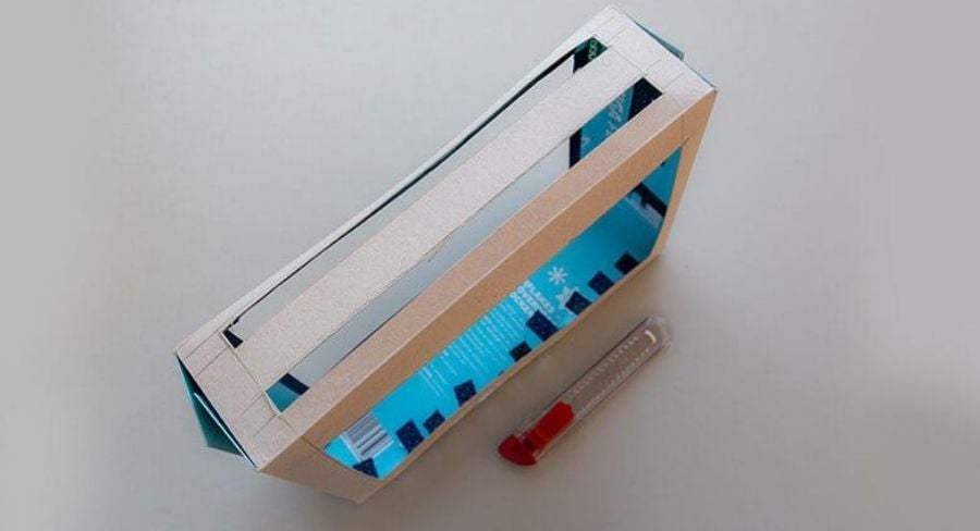 Arma la caja al revés como muestra la imagen. Utiliza pegamento para unir y cinta para asegurar bien las uniones.