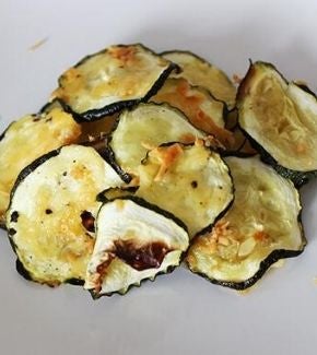 Descubre una nueva receta para preparar chips de zucchinni al horno con parmesano y sal marina. Un snack saludable para una tarde cualquiera